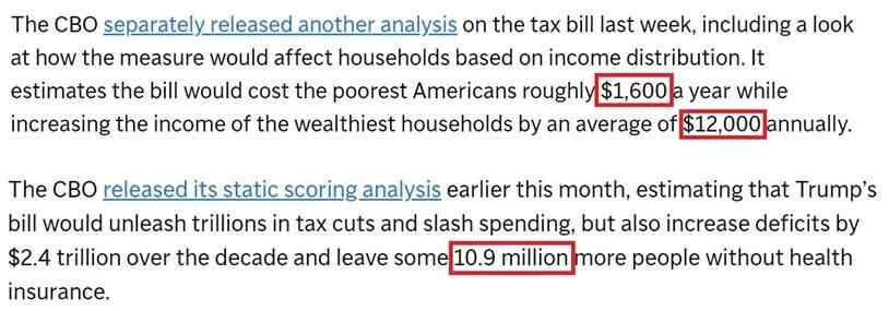 据美国国会预算办公室估计,“大而美”法案将使美国最富裕家庭的收入平均每年再增加1.2万美元,同时使最贫穷的美国人每年额外花费约1600美元。此外,该法案还将导致上千万低收入美国人失去医疗保险。