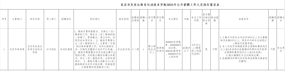 今年5月23日,北京先农坛体校发布的一则“招聘乒乓球教练需求表”引发关注。
