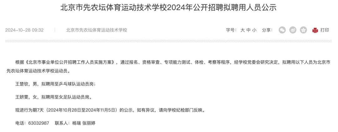2024年10月28日,北京市体育局官网发布《北京市先农坛体育运动技术学校2024年公开招聘拟聘用人员公示》,王楚钦在列。