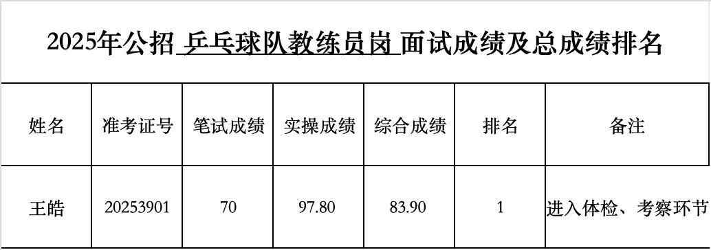 6月19日,据北京市体育局官网消息,北京市先农坛体育运动技术学校公布2025年公开招聘乒乓球队教练员岗面试成绩及总成绩排名。