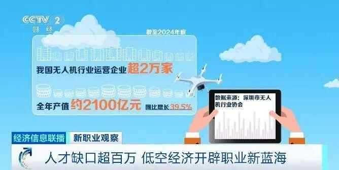 数据显示,截至2024年底,我国无人机行业运营企业已超过2万家,全年产值约为2100亿元,同比增长39.5%。在低空经济爆发式增长的背景下,无人机应用场景也在持续拓展,无人机系统工程师、无人驾驶飞行器培训师、无人机物流调度员、低空交通管制员、农业植保无人机操作员、森林防火无人机巡查员、低空飞行数据分析师等就业新方向也应运而生。