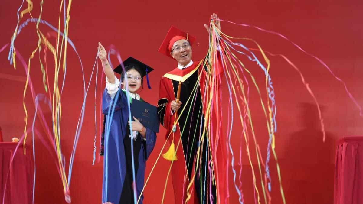 值得一提的是,在拨穗礼环节上,孙其信校长全程微笑服务,,照顾到每个毕业生的仪式感,陪大家搞怪合照、花式比心、碰杯毕业酒、拉彩带……