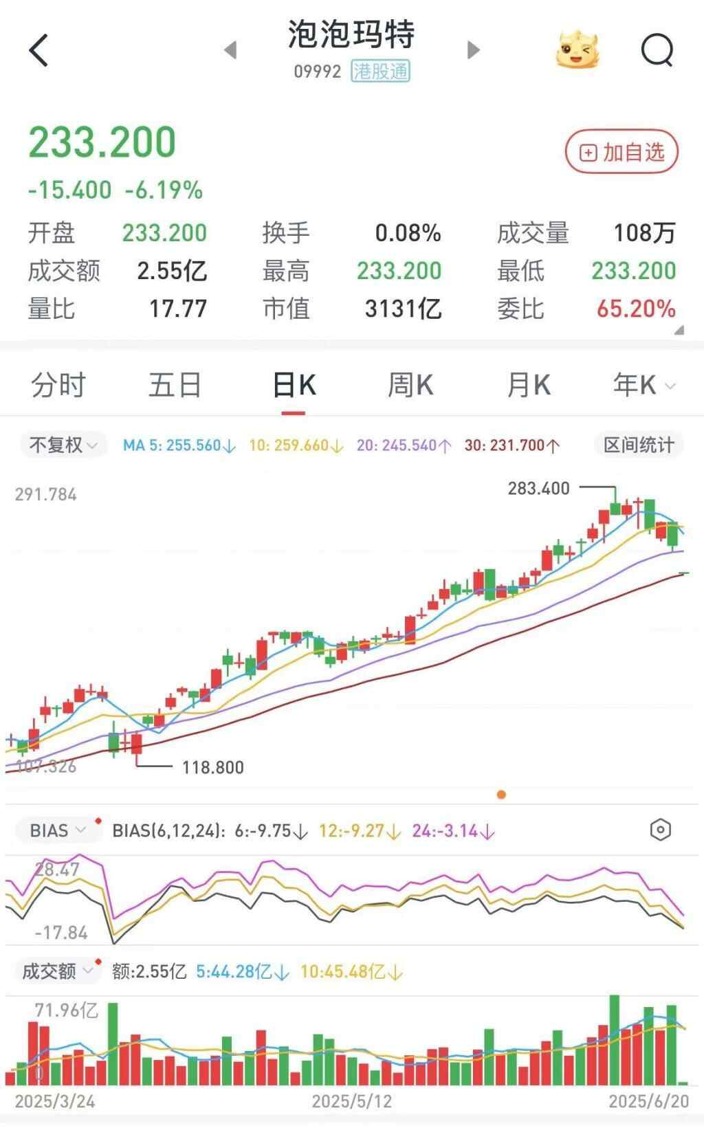 至此,泡泡玛特在过去的6个交易日内,从最高的283.4港元/股已跌至233.2港元/股,跌幅高达17.71%。