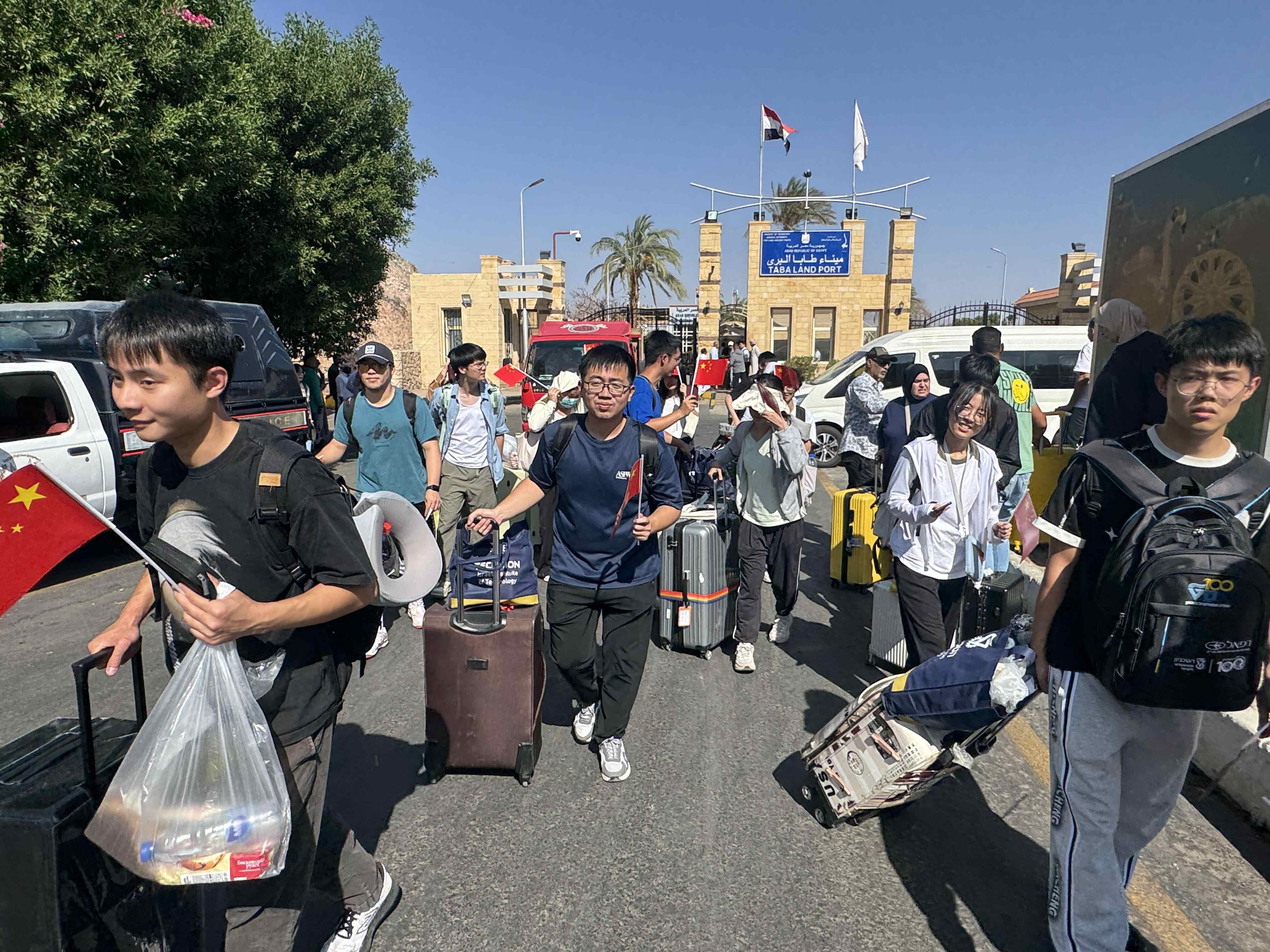 6月19日,从以色列撤离的中国公民从埃及南西奈省塔巴口岸进入埃及。