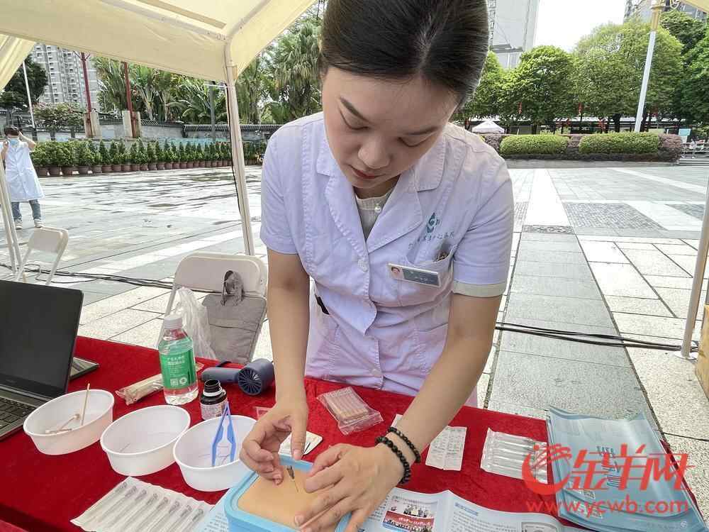 在演示环节中,针灸科医生展示了埋线操作。荔湾中心医院中医针灸科中医师卢洁旋介绍:“埋线通过刺激穴位,提高患者身体代谢,调节内分泌,有助于减重。”