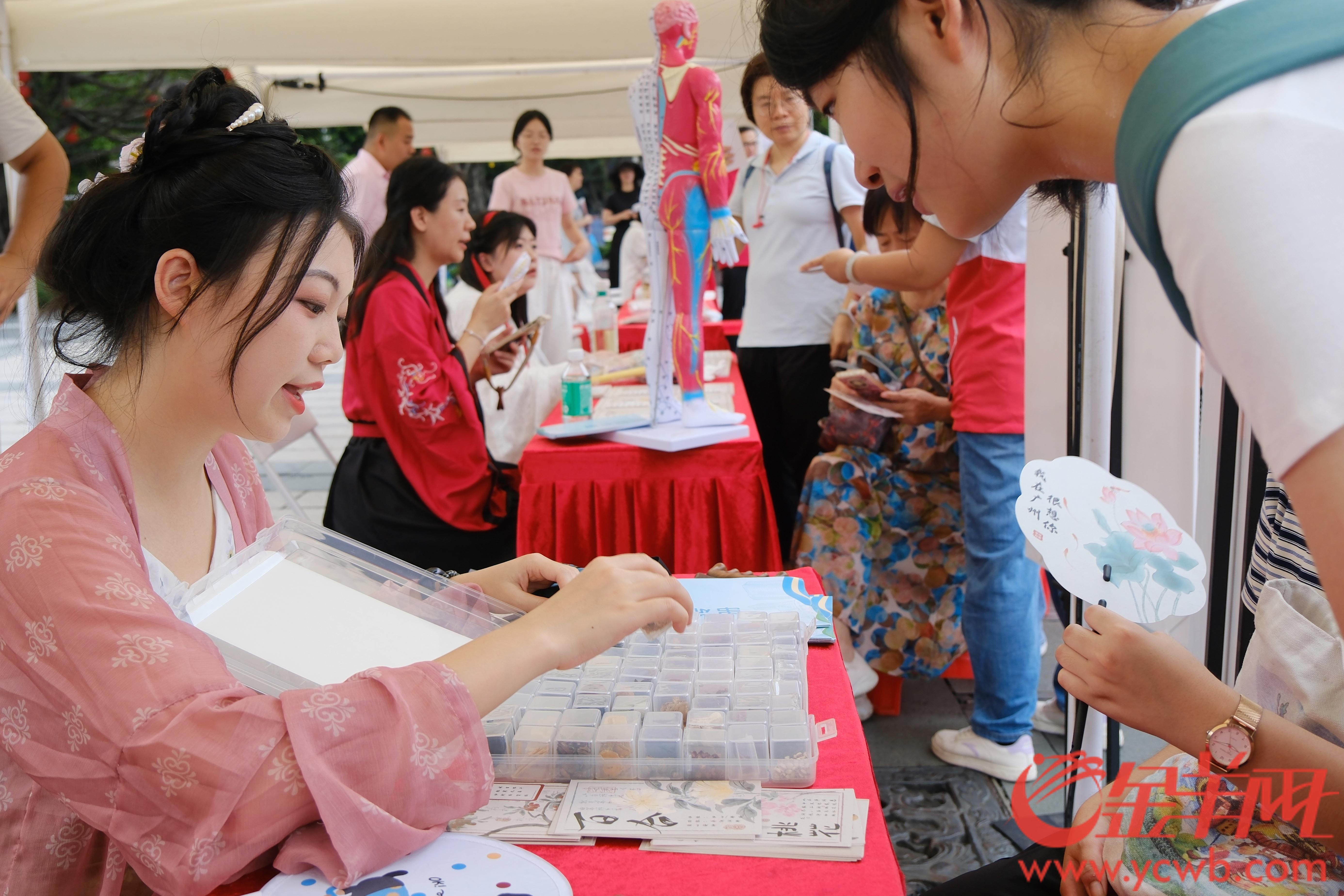 本次活动在荔湾区卫生健康局指导下,由广州市荔湾中心医院主办,荔湾区金花街道办事处协办。现场汇聚了荔湾区骨伤科医院等7家医疗机构共同参与,吸引不少市民游客驻足体验中医药文化。
