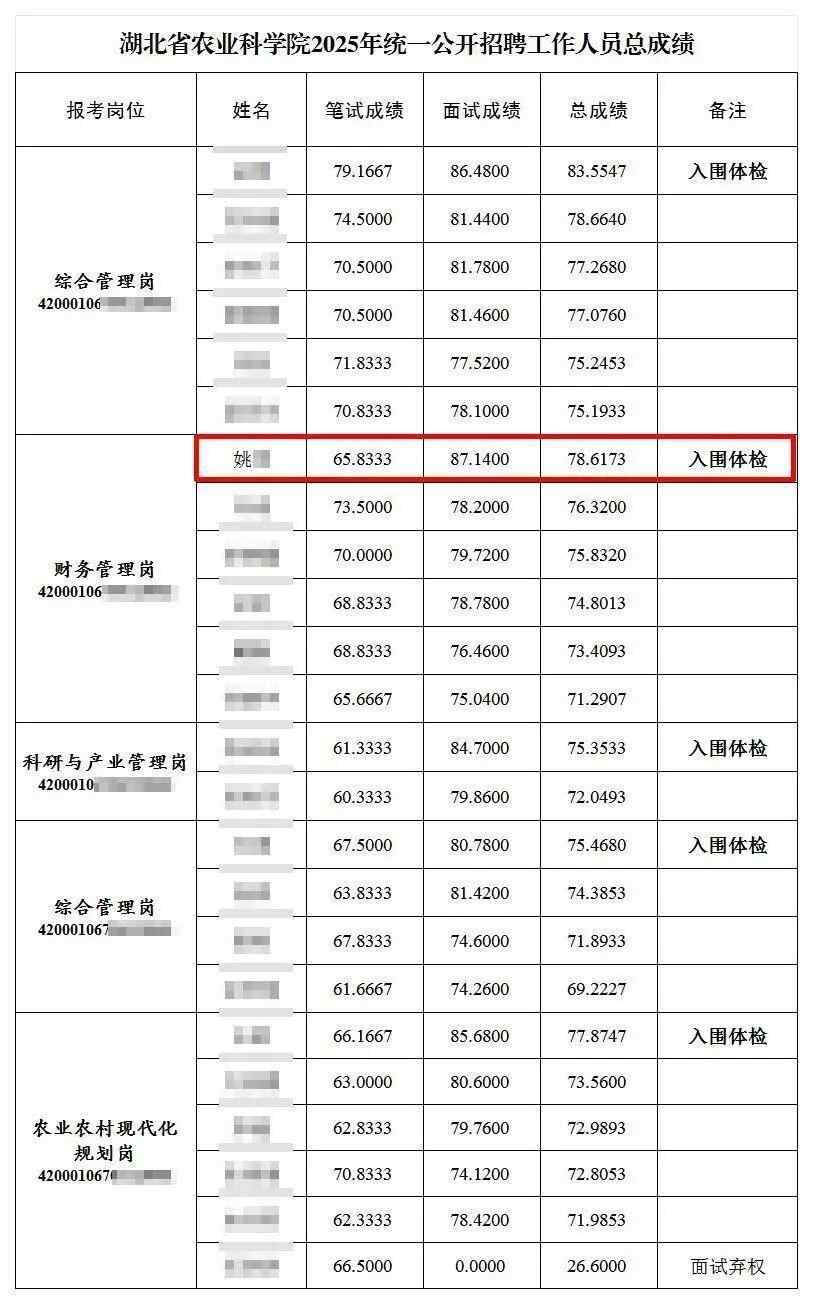 近日,湖北省农业科学院公布了一份《2025年统一公开招聘工作人员总成绩》,其中有一名笔试成绩倒数第二、面试成绩第一的应聘者,成功进入了“入围体检”环节,网友质疑招聘疑似“萝卜坑”。