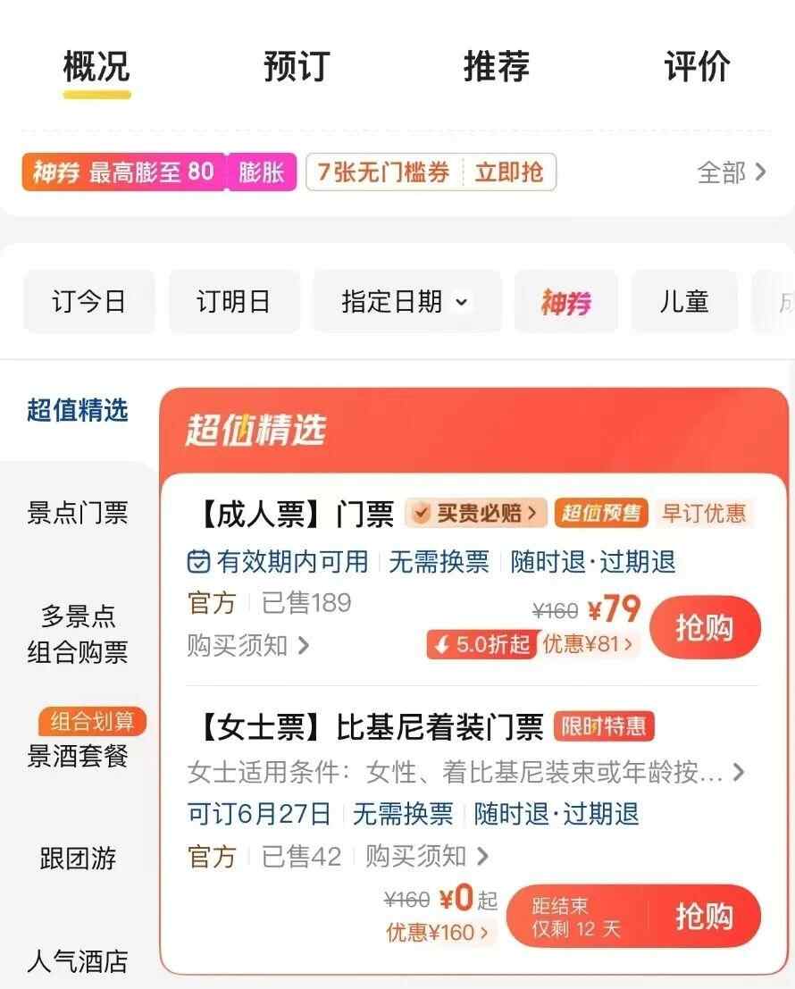 从网传的第三方平台购票页面截图可见,一张标注为0元的 “比基尼着装门票” 十分醒目,适用人群明确为女士,可预订日期一度显示为6月27日,且已售出94 张。不过,6月19日,记者在各大售票平台已无法查询到此类门票信息。
