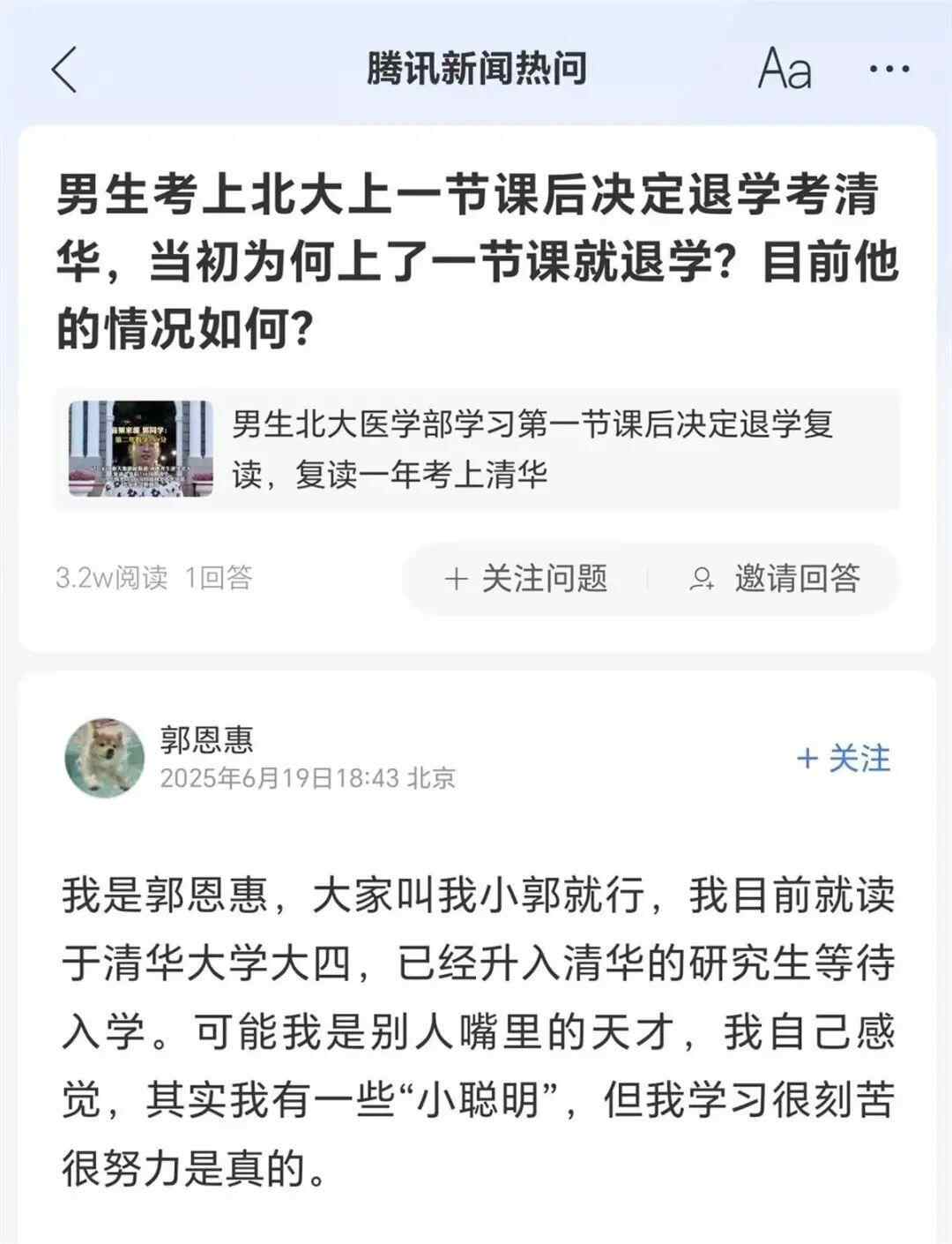 近日,2019年在北京大学上了一节课就退学,一年后又考上清华大学的河南小伙郭恩惠频频登上热搜。6月19日,郭恩惠在腾讯新闻“热问”发声,讲述自己当年的心路历程。如今,郭恩惠即将结束清华的本科生活,将于下半年开启研究生阶段的学习。