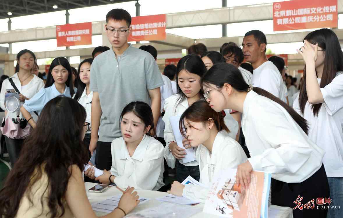 重庆财经职业学院举办“渝快就”重庆市2025届高校毕业生就业“百日冲刺”行动暨2026届毕业生岗位实习推介会,150余家用人单位现场招聘岗位超8000余个。招聘需求涵盖制造业、建筑业、交通运输、金融业等14个行业,满足了不同专业毕业生的求职需求。现场同时设置就业指导、升学咨询、征兵宣传、留渝就业等咨询服务专区,为毕业生解答留渝就业、入伍预征等相关政策。图为毕业生们与用人单位洽谈。(陈仕川摄/光明图片)
