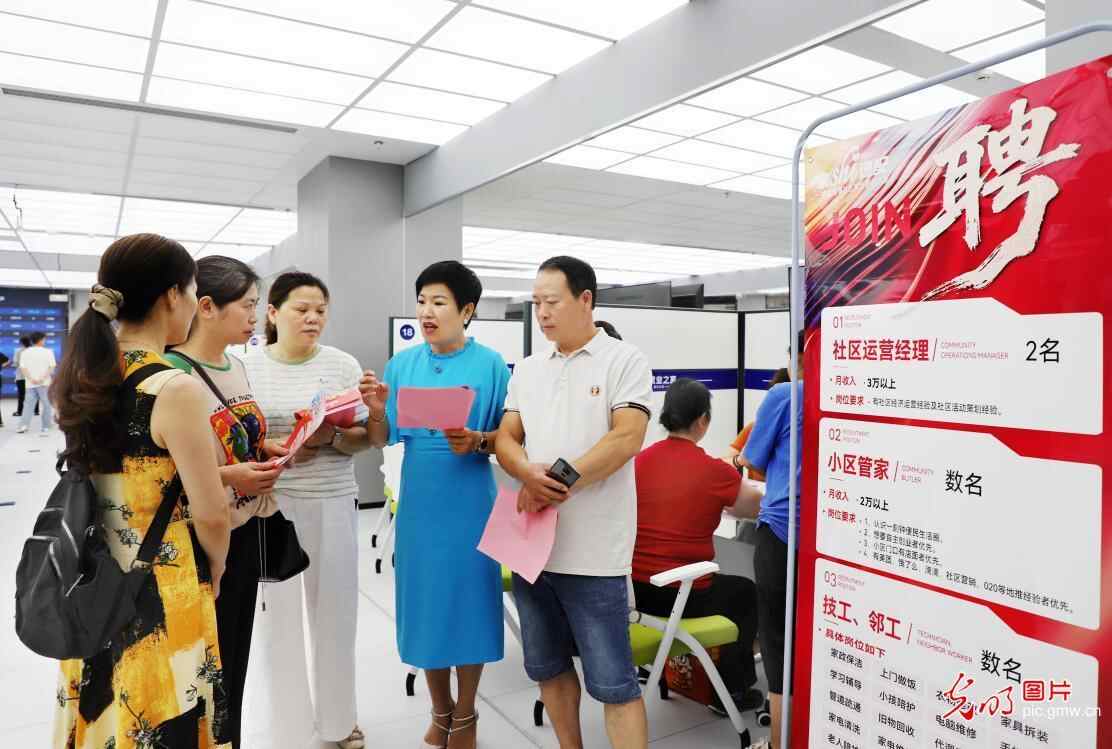 2025年6月19日,江西省新余市渝水区“百日千万招聘专项行动”专场招聘会在城南街道就业之家举行,50多家用人单位到场参会,提供就业岗位5000余个。图为工作人员向求职者介绍企业用工信息。(廖海金摄/光明图片)