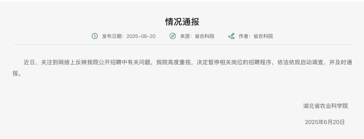 6月20日,湖北省农业科学院发布情况通报称,近日,关注到网络上反映我院公开招聘中有关问题,湖北省农业科学院高度重视,决定暂停相关岗位的招聘程序,依法依规启动调查,并及时通报。