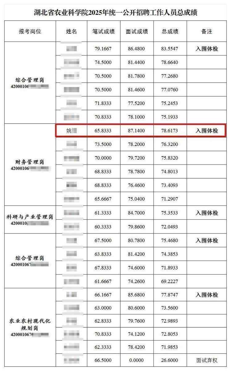 据媒体报道,6月16日,湖北省农科院在其官网发布《湖北省农业科学院2025年统一公开招聘工作人员总成绩公告》。在财务管理岗成绩一栏,考生姚某成绩引发关注,在6名考生中,姚某笔试成绩倒数第二、面试成绩第一,以总成绩第一的身份入围体检名单。