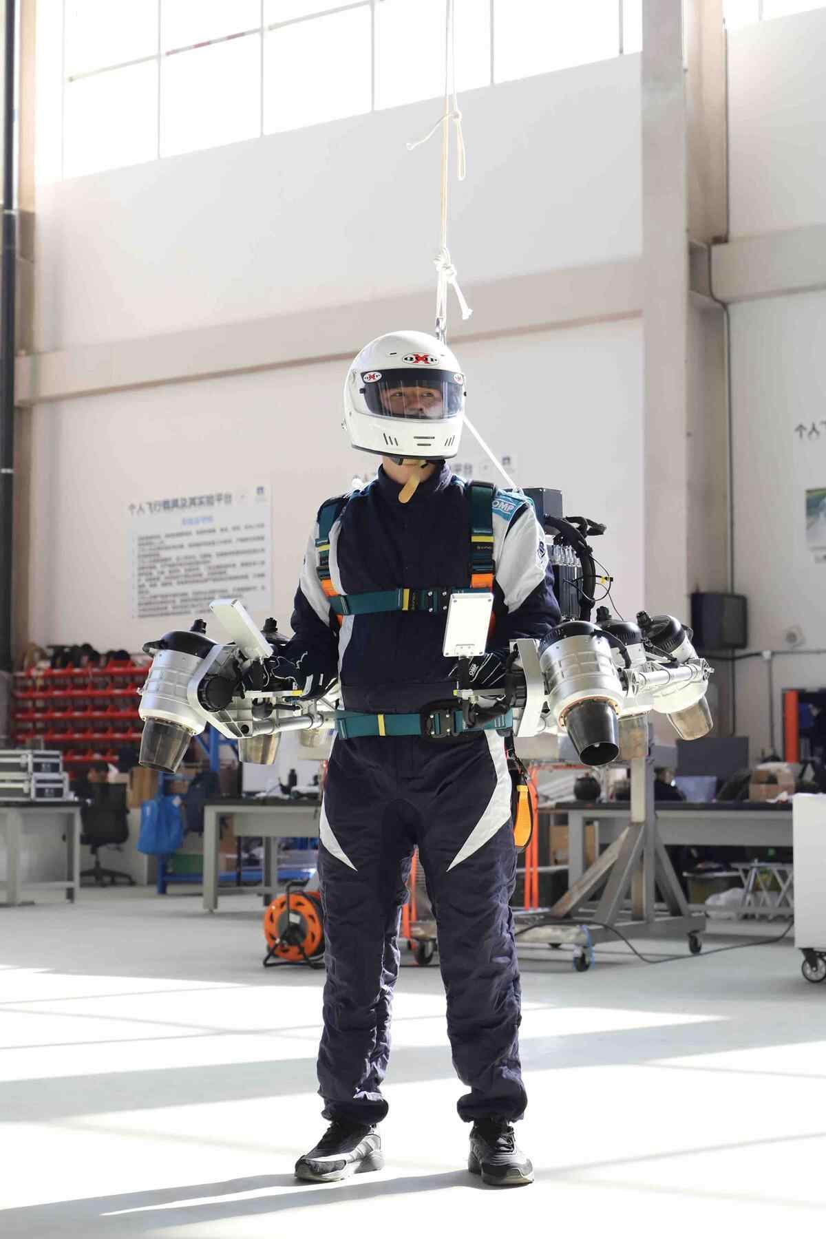 陈旭智介绍,单人喷气飞行背包是以矢量涡轮喷发动机阵列为动力,通过显控界面实现手柄操控功能,再配备平台管理和飞控模块,就能进行“傻瓜式”操作了。“风速体感就类似于开敞篷车。使用中不需要飞行员自身做太多的控制设置,只需要输入相应的速度要求和指令。”