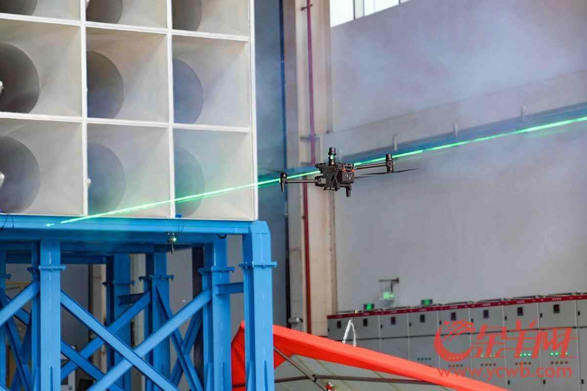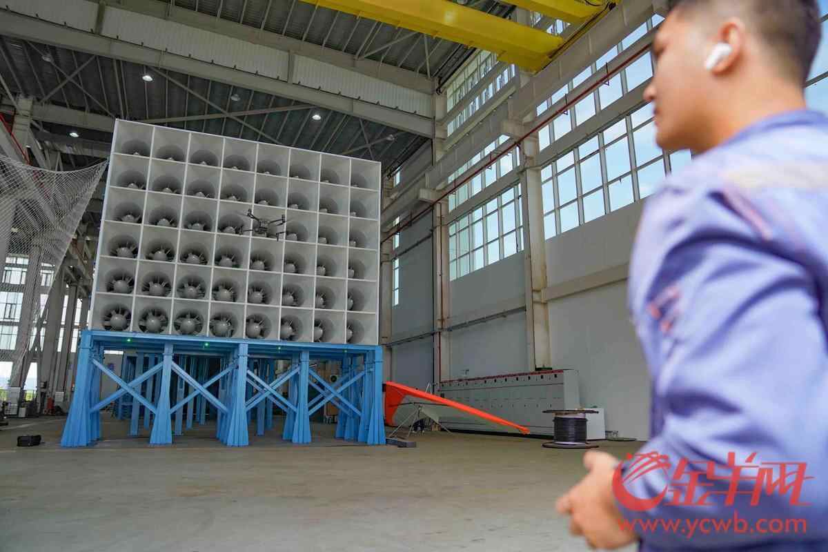 在风洞试验区,羊城晚报记者看到一台无人机正在不间断地接受“狂风洗礼”。广空院气动设计师、低空飞行器风洞试验平台负责人尚祖铭表示,平台正在模拟最大7级风环境(风速13.9-17.1m/s),开展持续风、阵风及切向风场景下的抗风性能验证。
