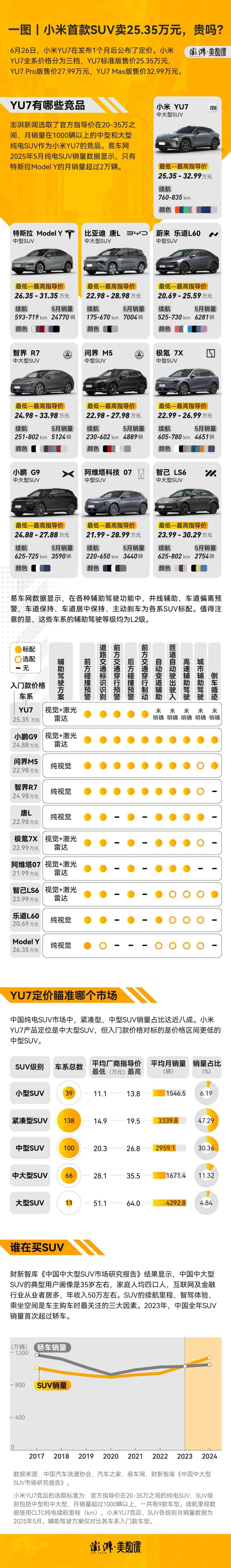 6月26日,小米YU7在发布1个月后公布了定价。小米YU7全系价格分为三档,YU7标准版售价25.35万元,YU7 Pro版售价27.99万元,YU7 Max版售价32.99万元。YU7预计8月开启首批交付,将与特斯拉Model Y、极氪7X、小鹏G7、问界M7等同级别车型展开竞争。