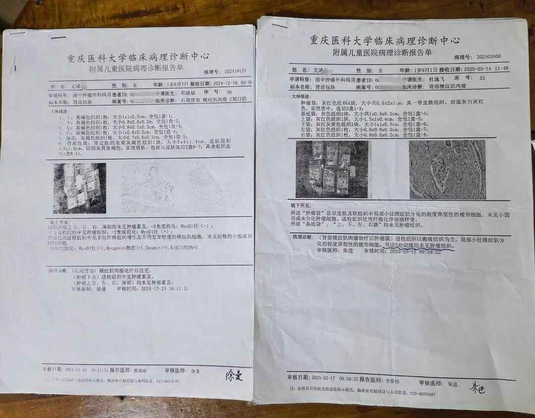 术后病理检查确认,浠浠患上了横纹肌肉瘤。“还是不敢相信,我们又到重庆儿童医院做复检,还是确诊的横纹肌肉瘤,而且是胚胎性横纹肌肉瘤。”