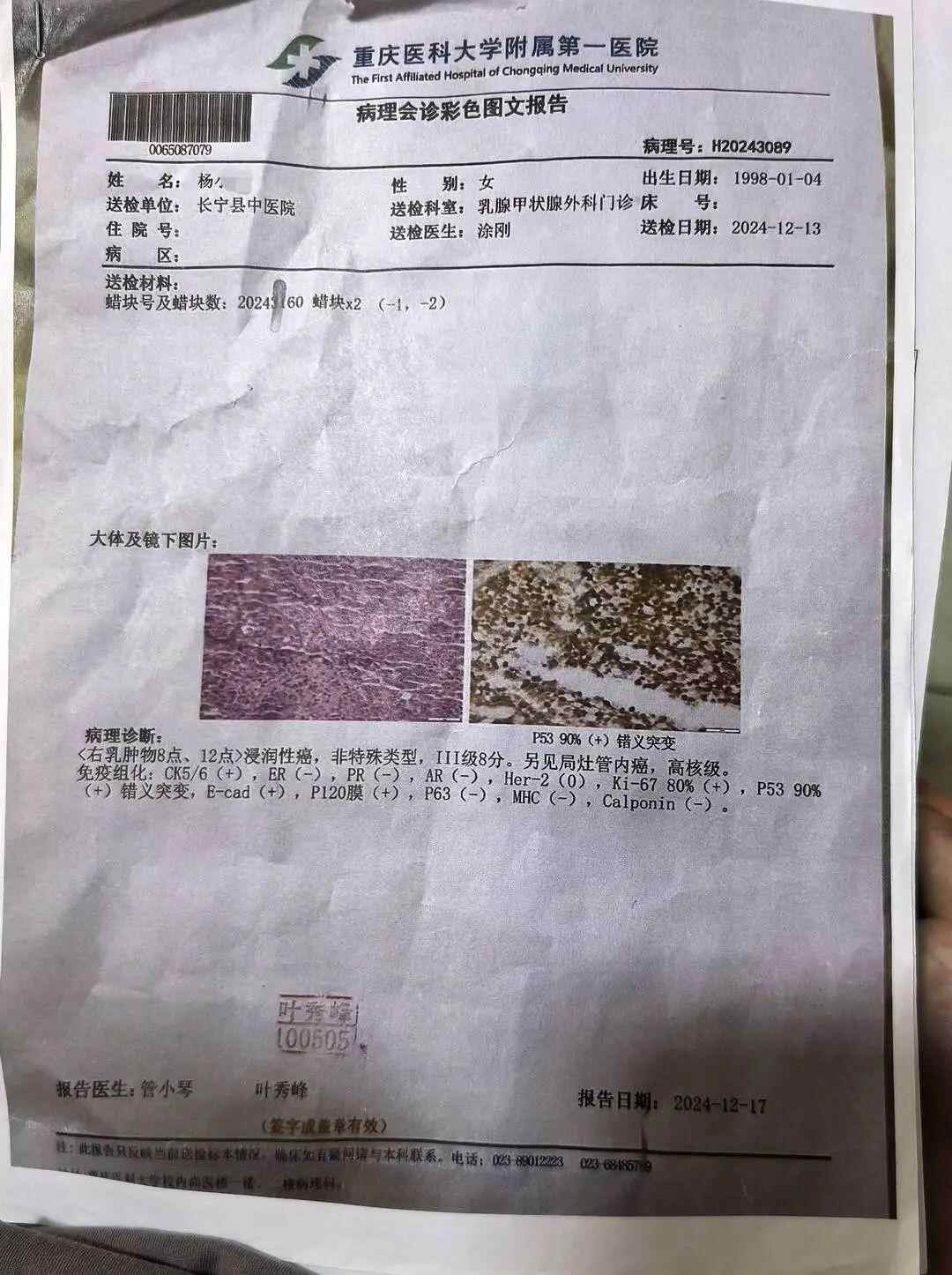 经过重庆医科大学附一院复检,杨女士确诊为三阴性乳腺癌。