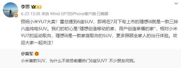理想汽车CEO李想送上祝福的同时也开启了广告模式,“相对小米YU7的运动取向,理想i8是一款家庭取向的SUV,更多照顾全家人的出行体验。”