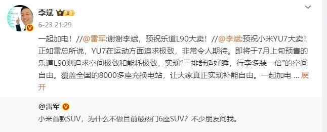 蔚来董事长李斌则转发雷军微博表示:“预祝小米YU7大卖!正如雷总所说,YU7在运动方面追求极致,非常令人期待。”