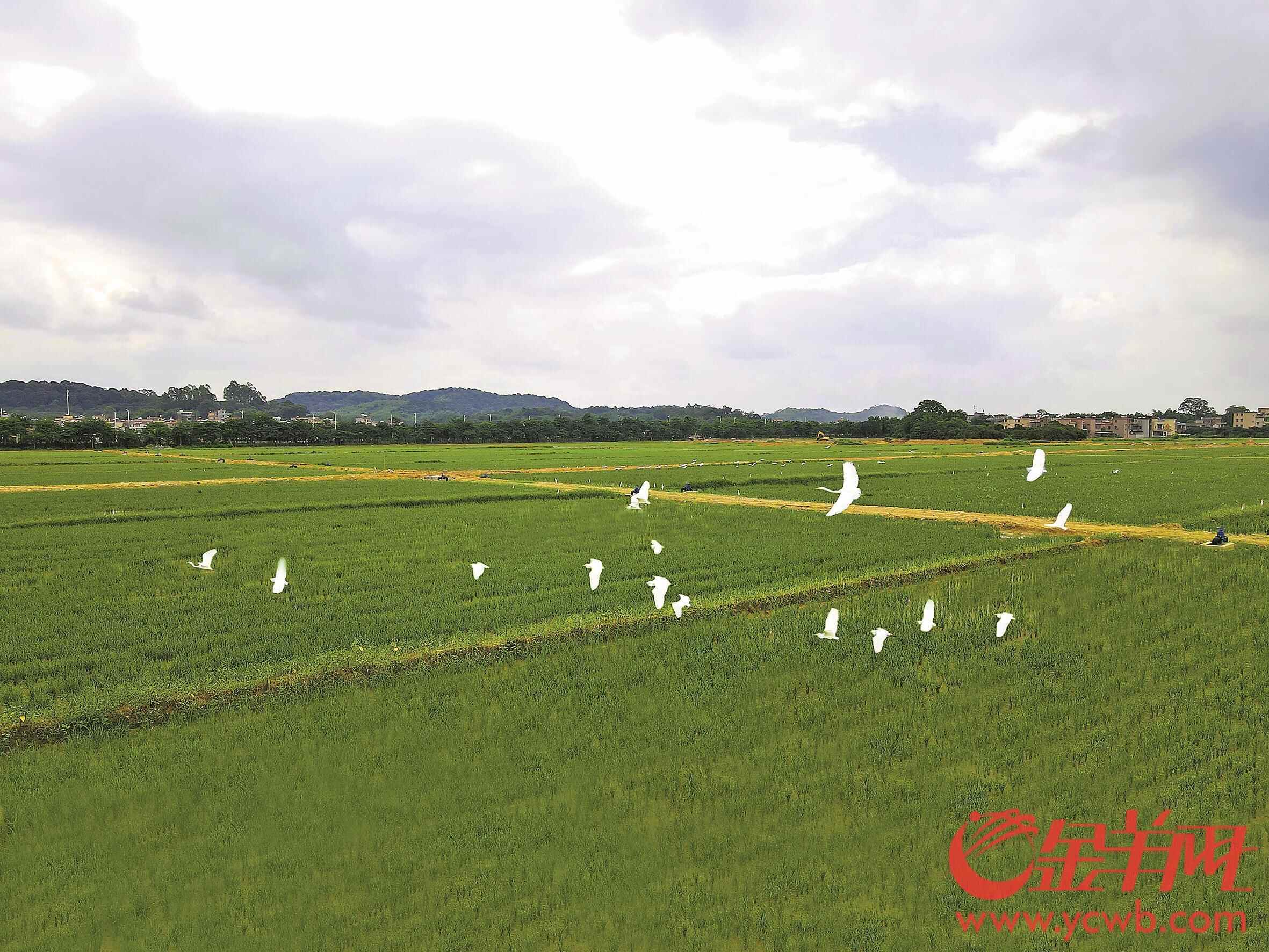 走进从化区鳌头镇万亩良田示范项目现场,“把中国人的饭碗牢牢端在自己手中”的红色标语映入眼帘,连片平整的田块如绿色棋盘向天际铺展。