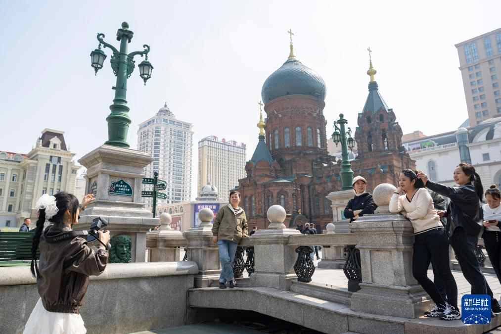 游客在哈尔滨市地标建筑索菲亚教堂附近游玩(2025年4月8日摄)。