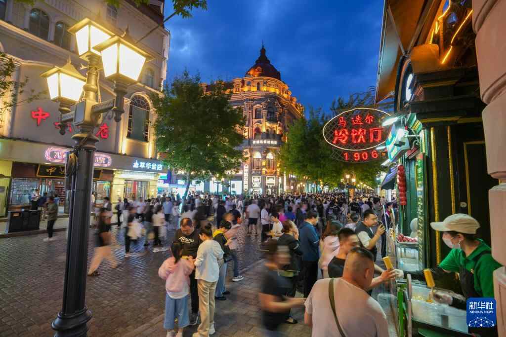人们在哈尔滨中央大街游玩、购物(2025年6月8日摄)。