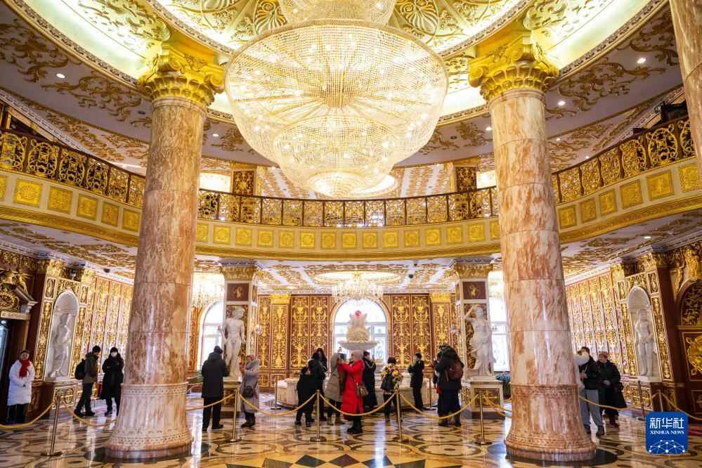 在哈尔滨市道外区,游客在哈药六厂主楼中参观(2024年1月17日摄)。哈药六厂主楼为欧式风格,雄伟壮观,被网友称为“东北卢浮宫”,成为哈尔滨旅游的热门打卡地。