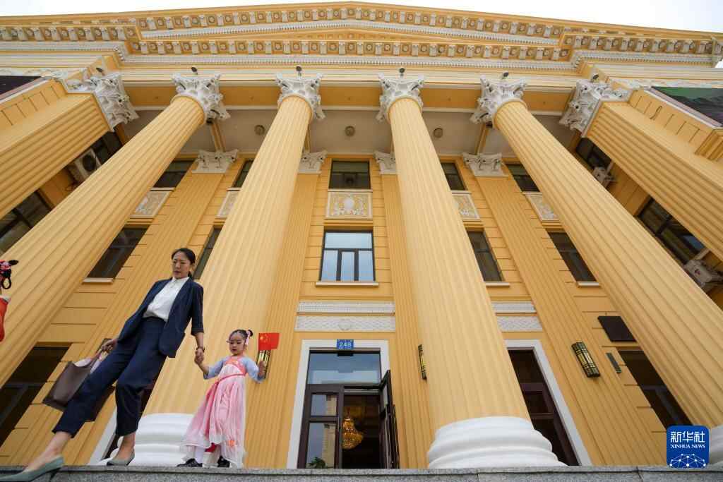 家长领着孩子走出哈尔滨工人文化宫(2025年6月8日摄)。哈尔滨工人文化宫建筑融合希腊式立柱、拜占庭式穹顶等折中主义风格。