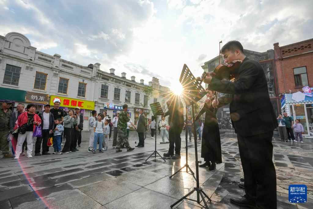 人们在位于哈尔滨市道外区的中华巴洛克历史文化街区欣赏街头演出(2025年6月7日摄)。