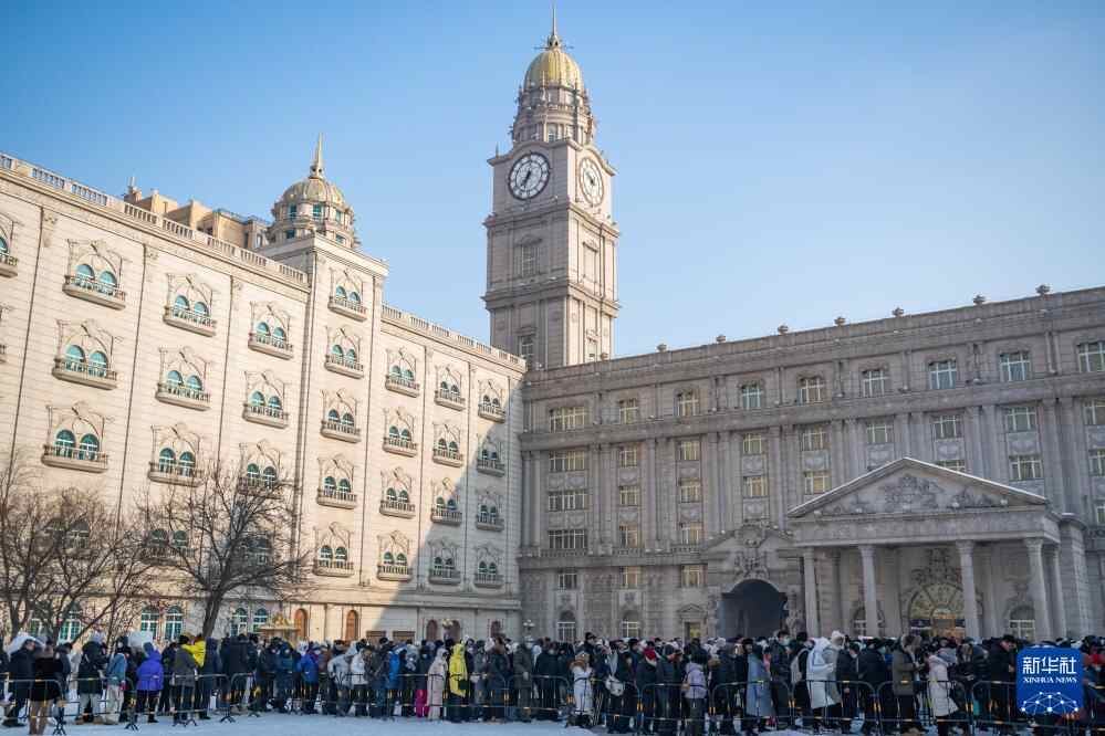 在哈尔滨市道外区哈药六厂厂区,游客排队进入主楼中的版画博物馆参观(2024年1月17日摄)。