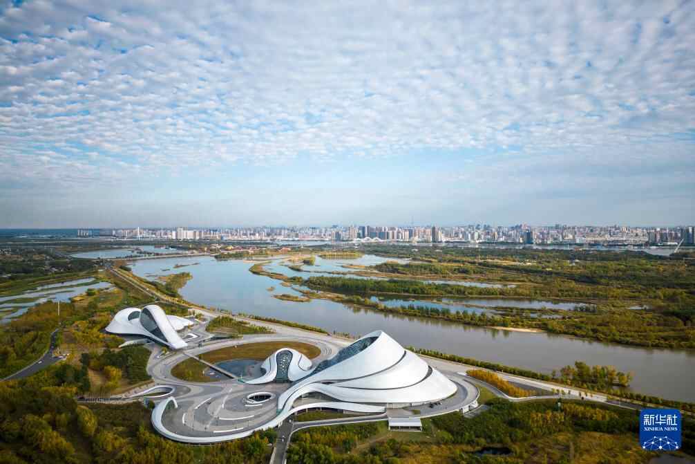 位于松花江畔的哈尔滨大剧院(2022年9月26日摄,无人机照片)。