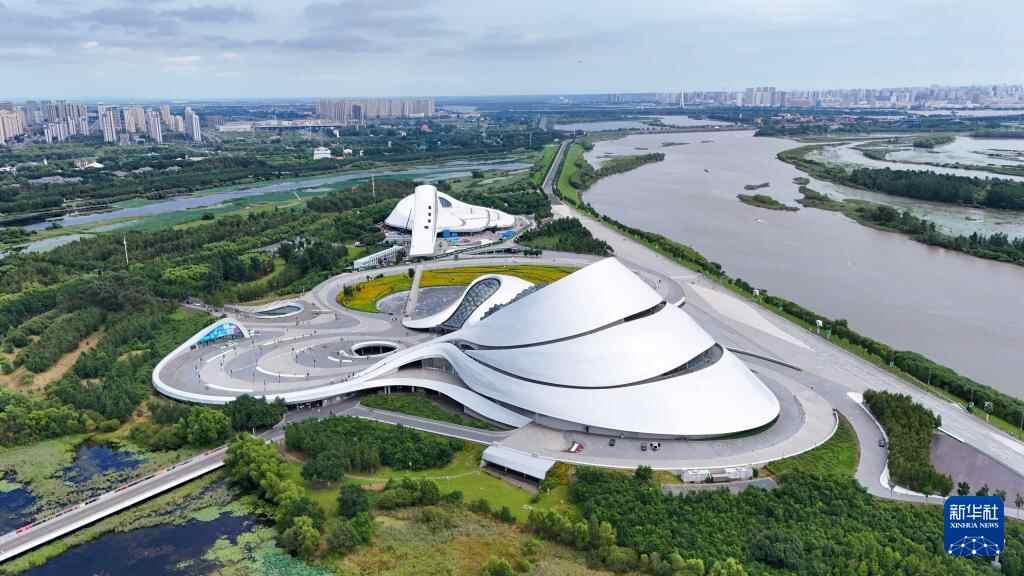 松花江畔的哈尔滨大剧院(2024年8月20日摄,无人机照片)。