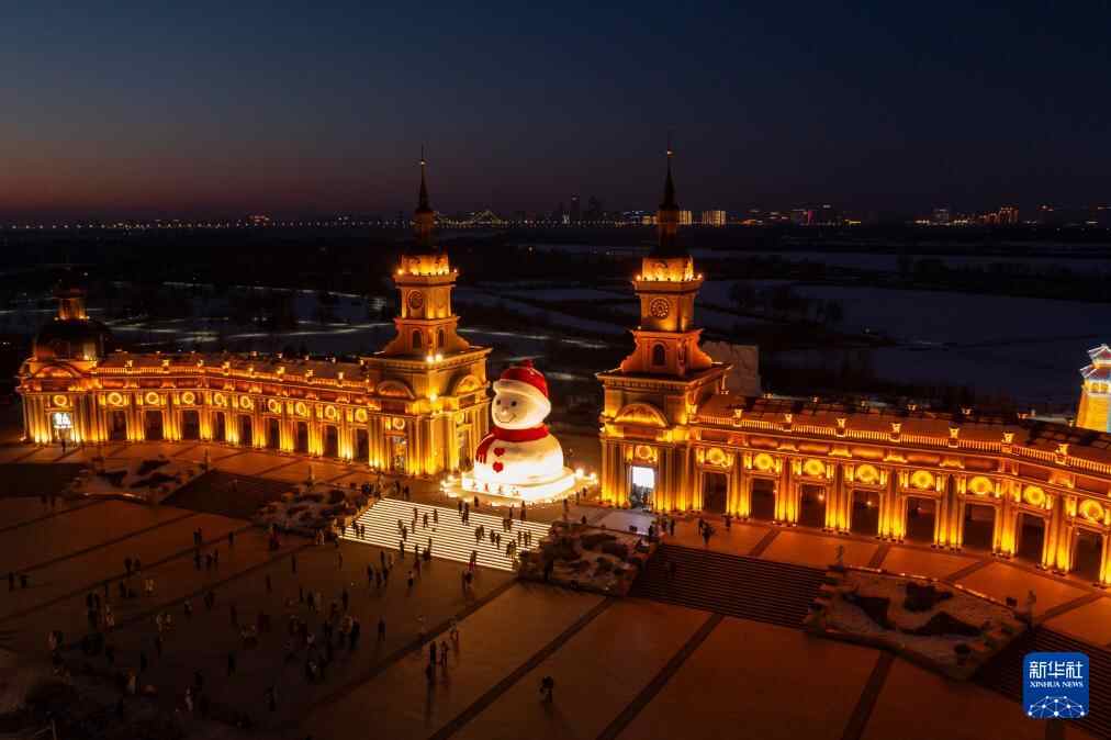 游客在哈尔滨群力音乐公园音乐长廊游玩(2025年1月3日摄,无人机照片)。