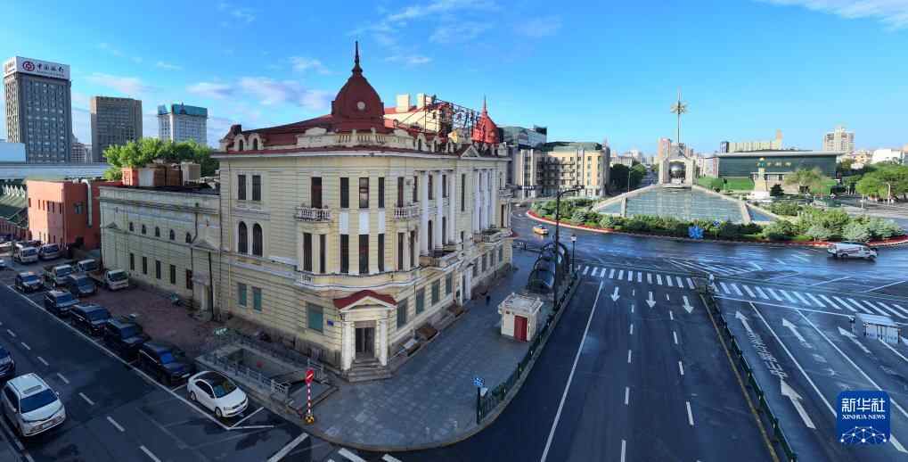 位于哈尔滨市南岗区的梅耶洛维奇宫旧址(2025年6月11日摄,无人机照片)。这是一座建于1921年文艺复兴风格的老建筑。