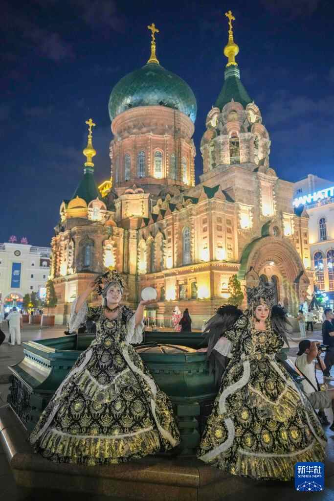 游客在哈尔滨建筑艺术广场盛装拍照(2025年6月8日摄)。