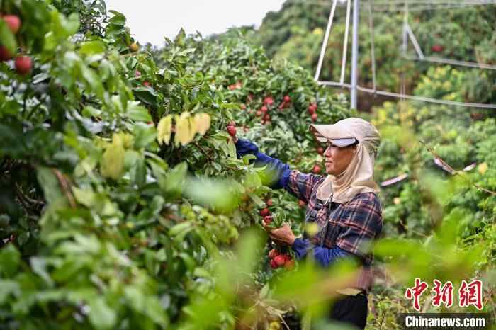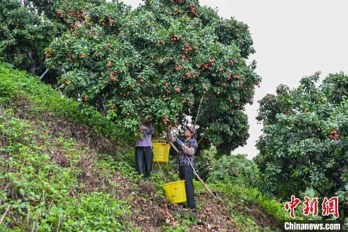 6月26日,果场工作人员采摘“仙进奉”荔枝。中新社记者 陈骥旻 摄