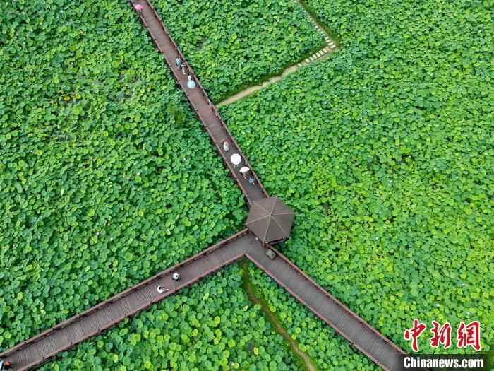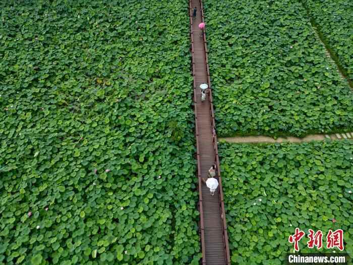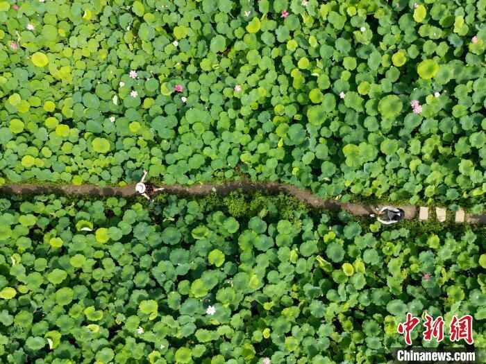 6月26日,四川省成都市新津区千亩荷塘吸引游人打卡。(无人机照片)中新社记者 张浪 摄
