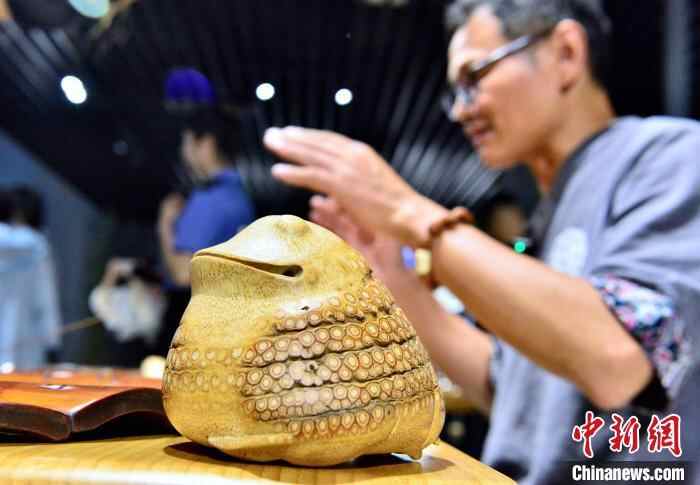 6月25日,“武夷竹刻”手工艺人向参观者展示的竹刻艺术品《竹青蛙》栩栩如生。福建武夷山素有“林海竹乡”之称,竹资源丰富,当地手工艺人创作的竹刻艺术品深受人们喜爱。中新社记者 张斌 摄
