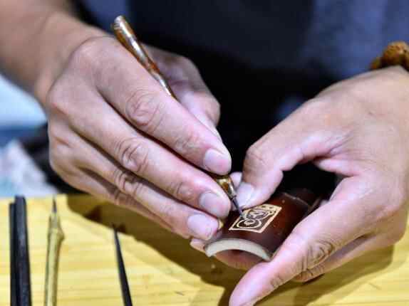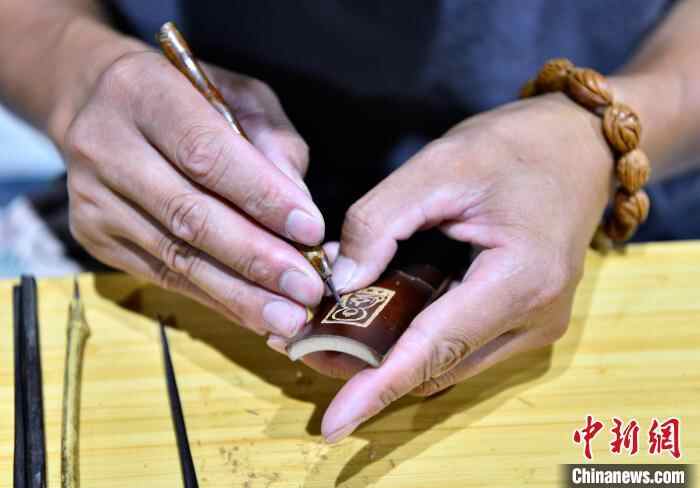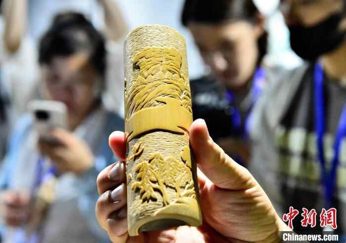 6月25日,手工艺人向参观者展示“武夷竹刻”制作技艺,普通的竹子经过打磨创作,变成精美的竹刻艺术品。福建武夷山素有“林海竹乡”之称,竹资源丰富,当地手工艺人创作的竹刻艺术品深受人们喜爱。中新社记者 张斌 摄