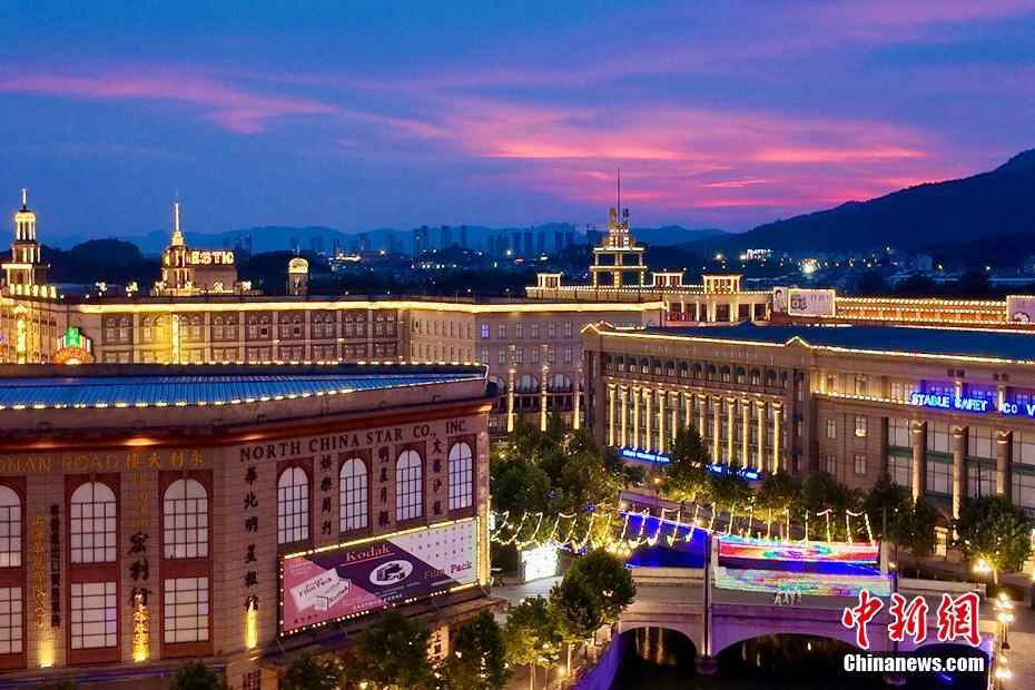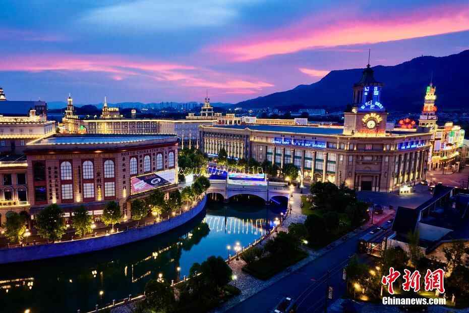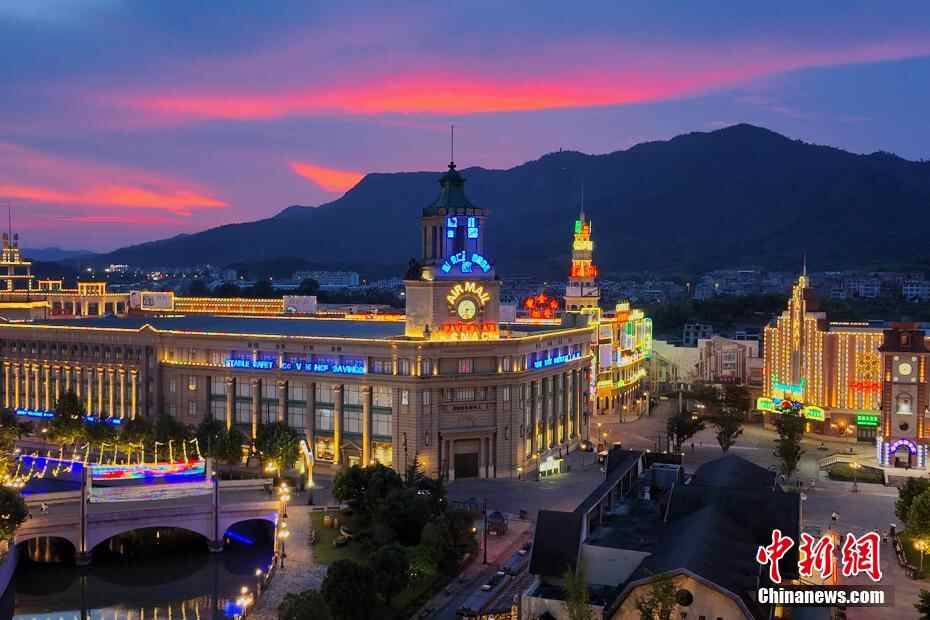 6月26日晚,浙江横店,晚霞映照下的横店影视城梦外滩,灯光璀璨。横店拥有全球最大的影视拍摄基地,其梦外滩景区以老上海为主要原型,再现了老上海融万国建筑于一处的海派建筑风格,展现出独特城市风情。