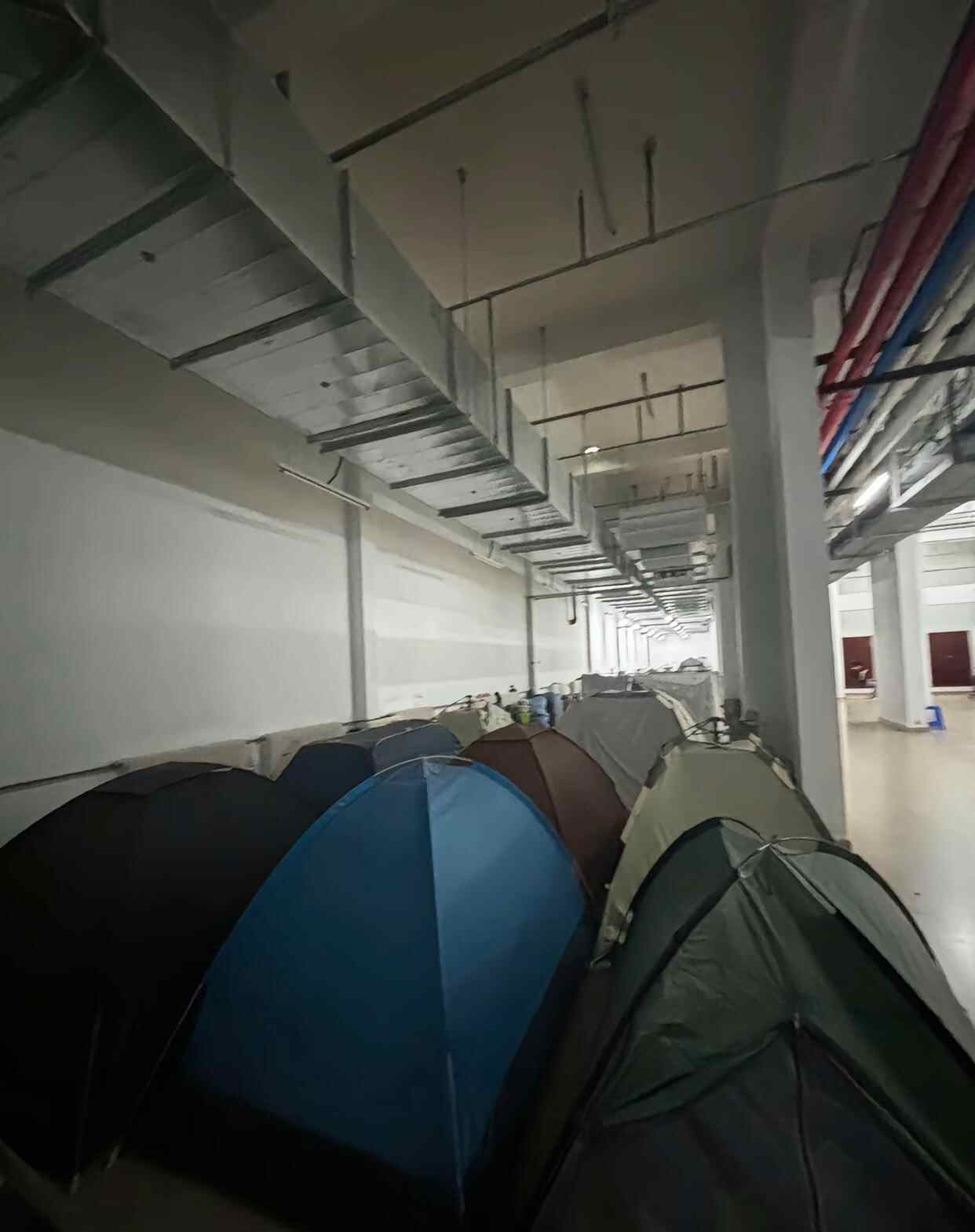 一名学生介绍,夜间宿舍里30多度,比室外还热,而宿舍楼地下室大概20多℃,因此不少同学在地下一层支帐篷过夜。他说,在宿舍安装空调的建议已经提了很多年,但仍未实施。