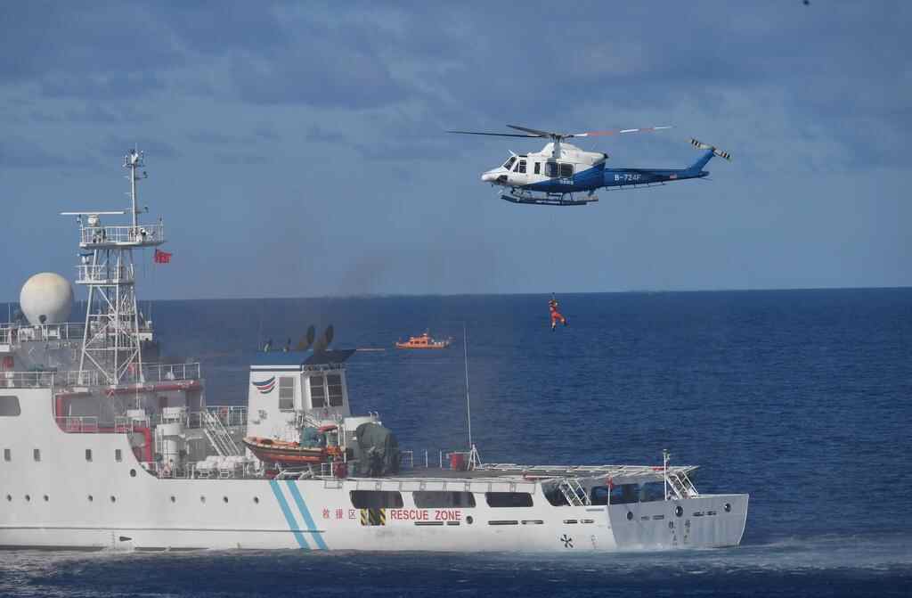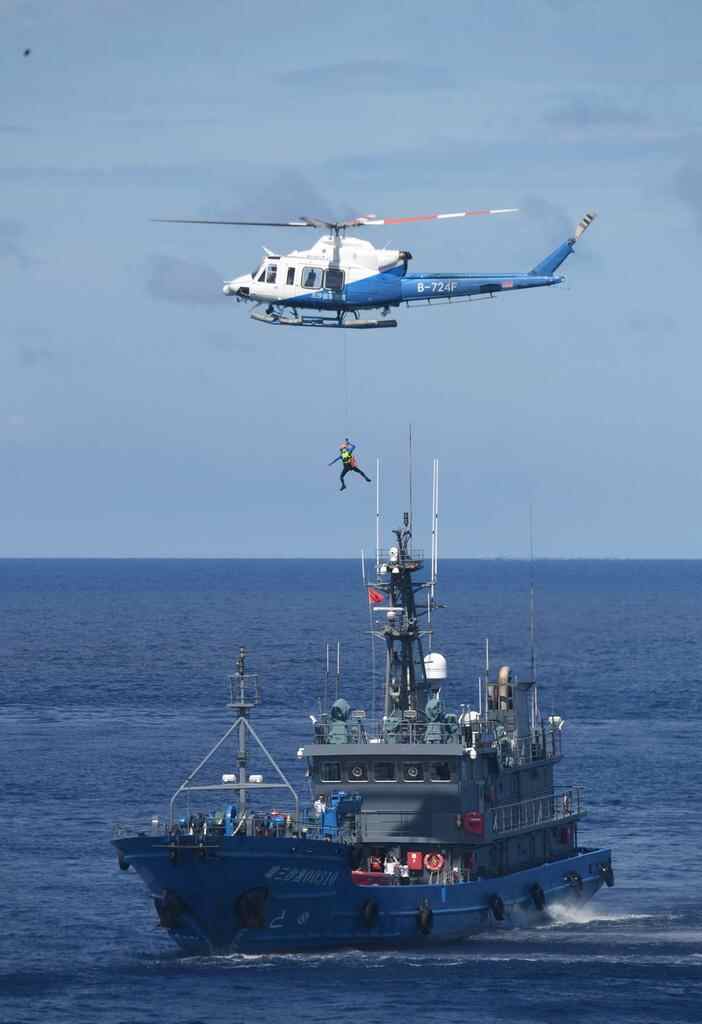 6月26日,救助直升机和船舶在西沙永兴岛附近海域开展协同演练。