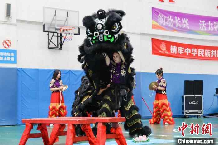 莎何娜斯(中间)表演舞狮。湖州师范学院供图