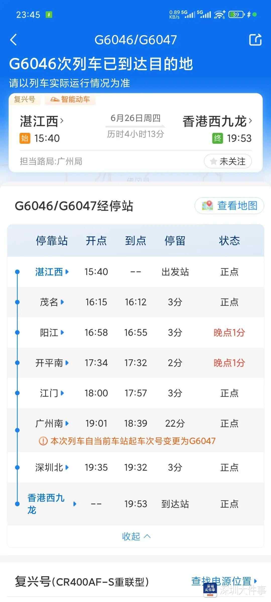 铁路12306平台显示,G6047次列车为复兴号(CR400AF-S重联型)列车,编组16辆,最高时速为350km/h,由湛江西站开往香港西九龙站,在到达广州南站前车次号为G6046,到达深圳北站时刻为19:32。