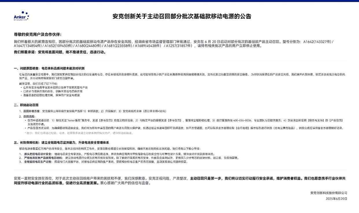安克在召回公告中表示,发现某供应商部分批次的行业通用电芯存在未经批准的原料变更,这可能导致极少数产品在长期循环使用后隔膜绝缘失效,进而引发过热甚至燃烧的安全隐患。为尽快消除潜在的产品安全风险,主动向市场监管部门提交召回申请。