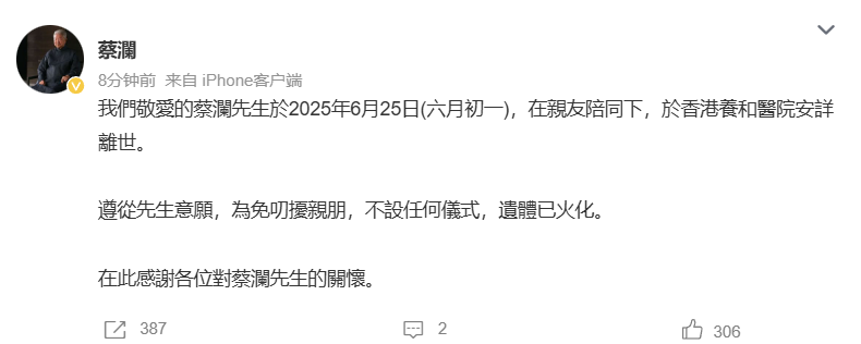 我们敬爱的蔡澜先生于2025年6月25日(六月初一),在亲友陪同下,于香港养和医院安详离世。