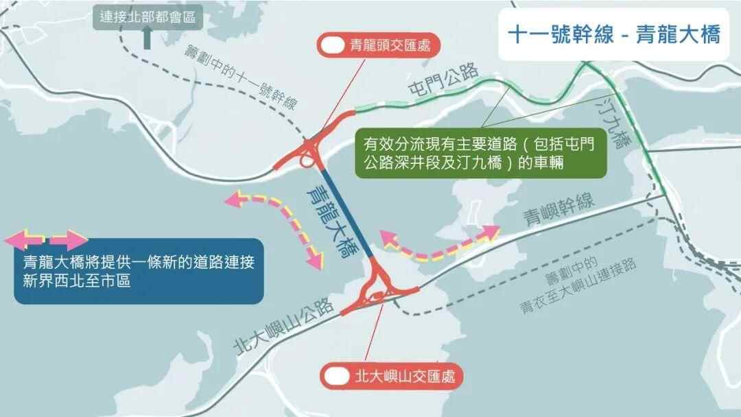 香港特区政府路政署近日表示,将分段建造十一号干线,连接北大屿山至新界西北,并将优先兴建青龙大桥段,争取2033年或之前开通。
