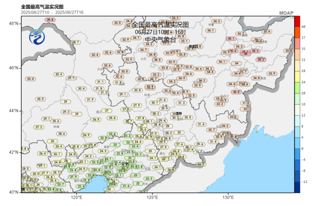 本周以来,黑龙江、吉林、辽宁、内蒙古东部热力不断升级,30℃大片出现,部分地区还迈过了高温线,像沈阳时隔6年冲上35℃,就连冬天低温榜单上的老面孔——漠河,也连续两天出现了高温。
