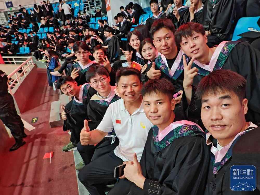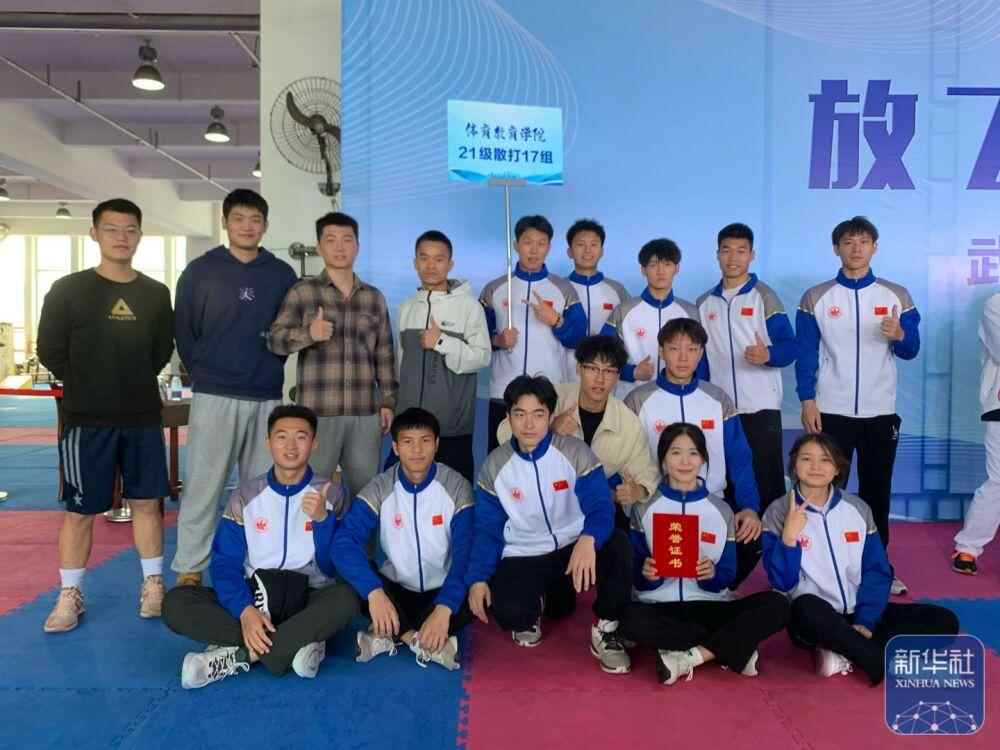 2022年11月12日,在武汉体育学院参加比赛后,林进标(前排左二)与老师、队友合影。